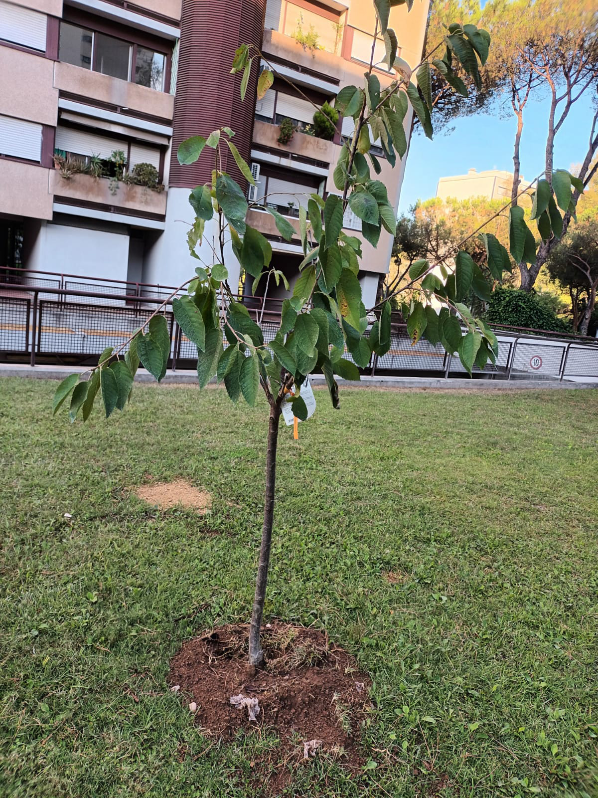 Il noce è dedicato a mio nonno, scomparso nel 1956 e il ciliegio a mio figlio Roberto, venuto a mancare nel 2018. Un legame tra le generazioni. Questo albero nobile, anche se materialmente Roberto non lo vedrà, crescerà tra le festose grida di ragazzini in gioco, le corse dei cani e le conversazioni degli adulti per passare il tempo. Egli ne godrà lo spettacolo della sua vitalità traguardandolo dalle nuvole e dallo spazio celeste, dove dimora da oltre sette anni.