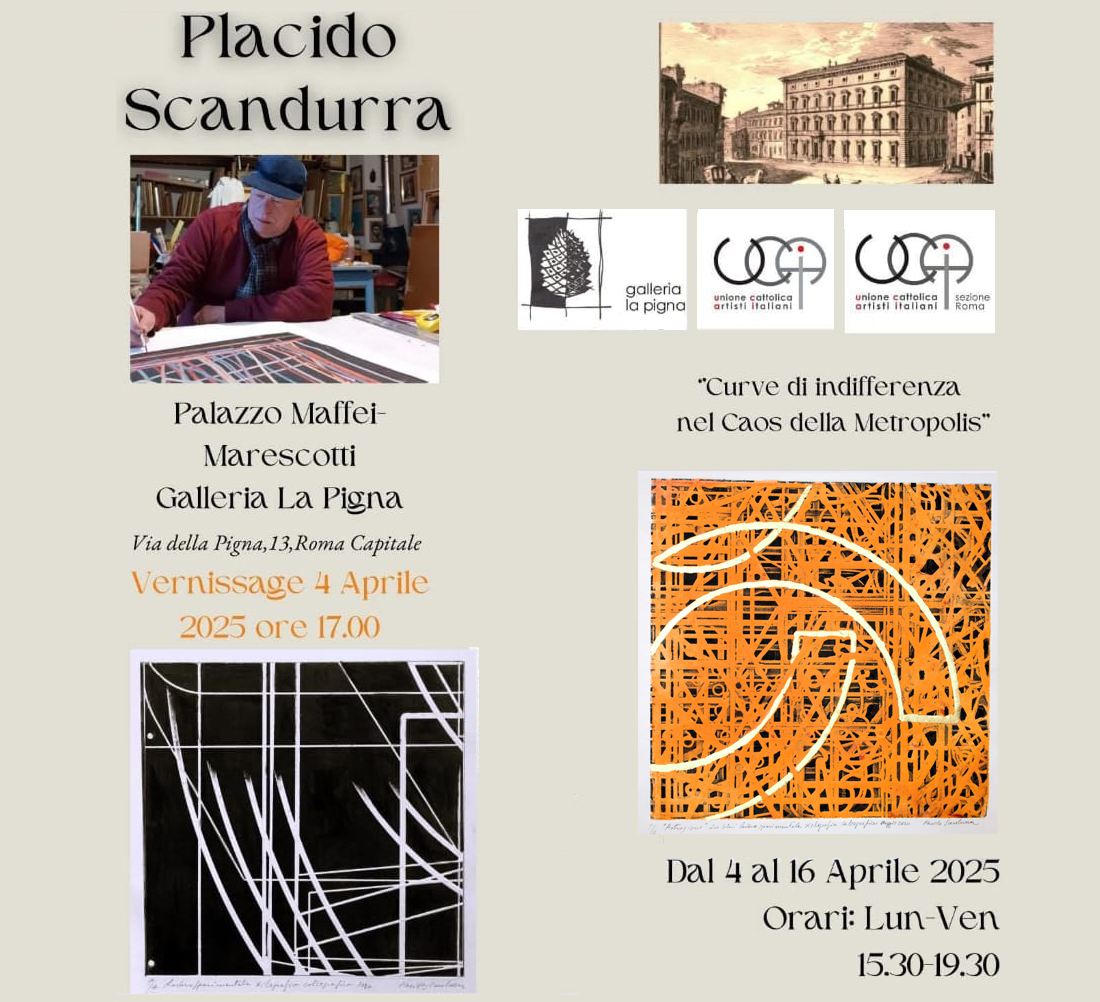 Venerdì 4 aprile, presso la Galleria ”La Pigna”, nel Palazzo Maffei Marescotti a Roma, si è aperta la Mostra personale del maestro Placido Scandurra, dal titolo “Curve di indifferenza nel Caos della Metropolis”, curata dalla figlia Elisa e il di lei consorte Claudio d’Alelio Marescotti, con il patrocinio dell’UCAI (Unione Cattolica Artisti Italiani).