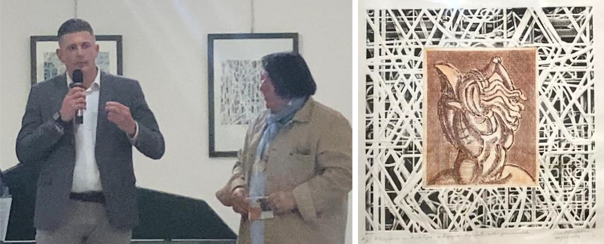 L'intervento del sindaco di San Polo dei Cavalieri Simone Mozzatta con Claudio Marescotti. A destra Placido Scandurra, Cavaliere inesistente tra circuiti metropolitani, 2024, Xilografia e incisione calcografica, cm 40x40 (foglio 70x50) - Foto Sonia Peters e Lucrezia Rubini