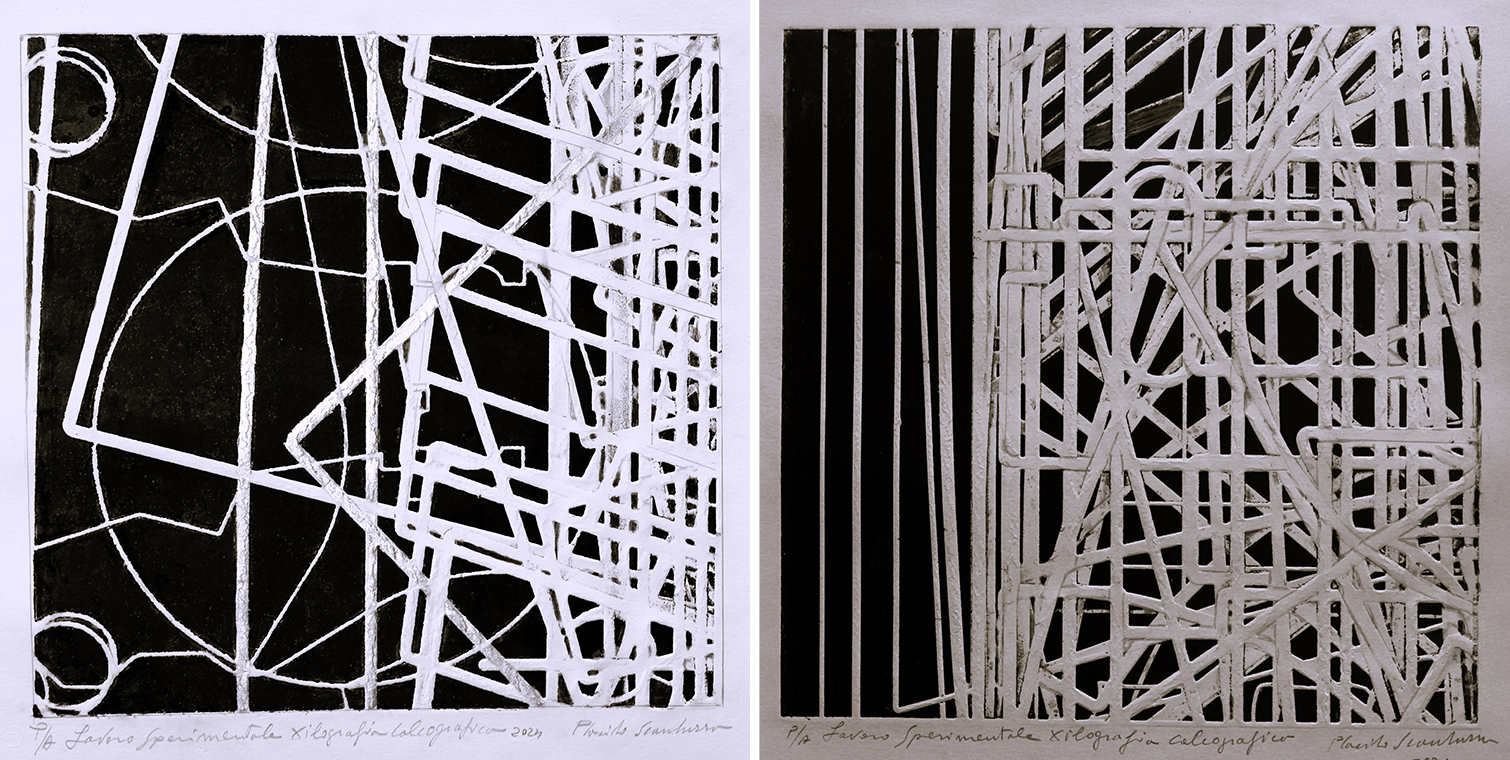 Placido Scandurra, La via maestra tra circuiti labirintici, 2024, Xilografia calcografica, cm 40x40 (foglio cm 70x40) e Curve di indifferenza nel caos della metropolis, 2024, Xilografia calcografica, cm 40x40 (foglio cm 70x50)