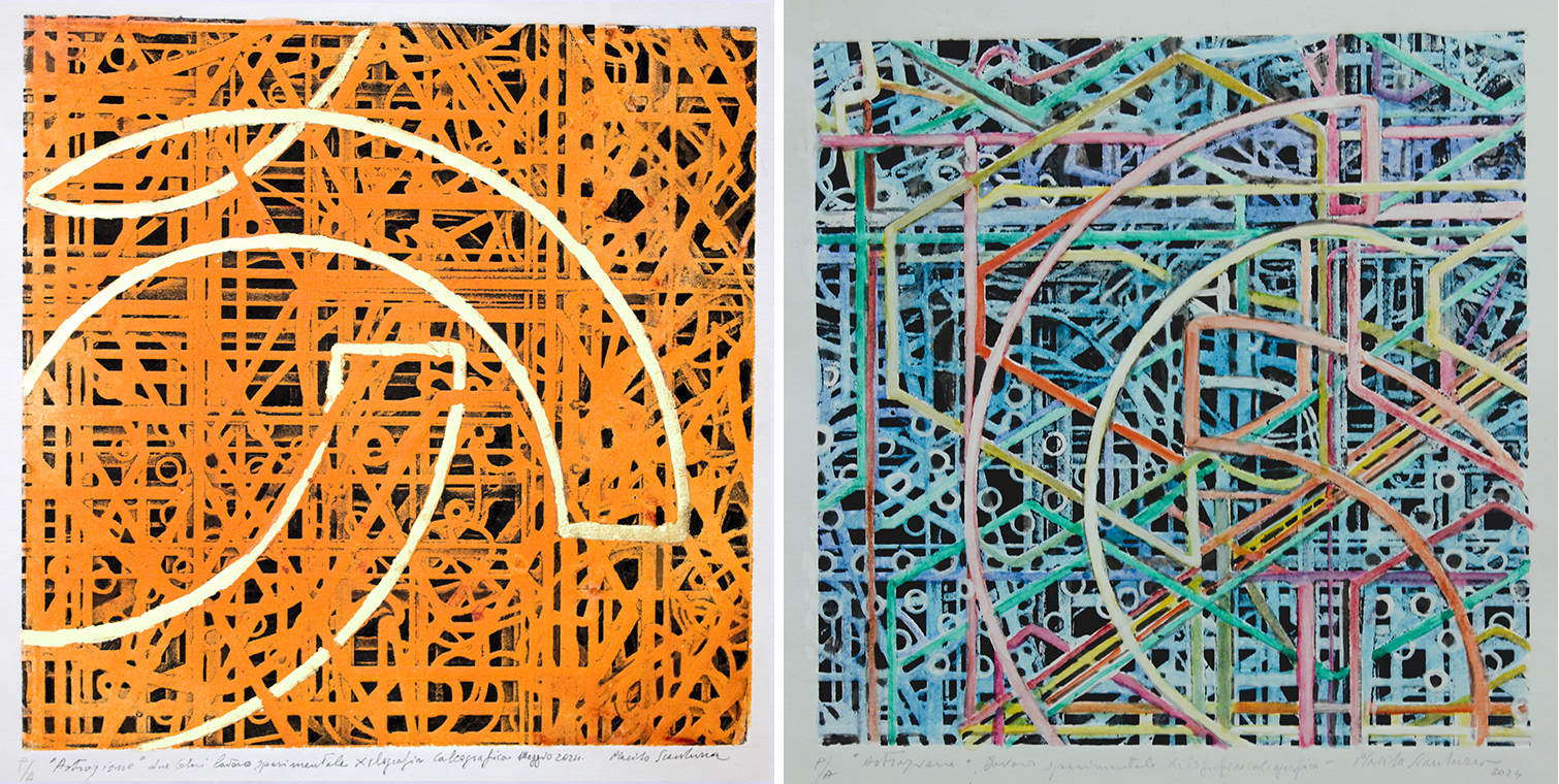 Placido Scandurra, Tracce di geometria sacra, 2024, Xilografia calcografica, cm 40x40 (foglio cm 70 x50) e Condensazione di intrecci, 2024, Xilografia calcografica, cm 40x40 (foglio cm 70x50)