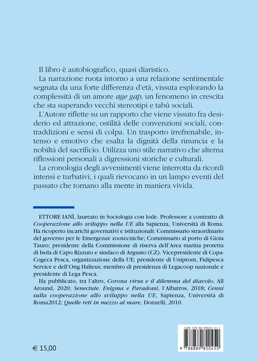 Come ama definirlo l’Autore, il quasi romanzo Un amore age gap, di Ettore Ianì (l’Albatros, novembre 2025, Roma), racconta una relazione sentimentale segnata da una forte differenza d’età e vissuta alla ricerca del desiderio e dal senso di fragilità sociale. È un racconto che alterna, senza significativi scossoni e svolazzi, introspezione e richiami a una cornice storico-politica. L’elemento dominante non è la emotività, il tono riflessivo, la narrazione personale su traumi o eventi significativi che hanno il corso della vita dell’Autore, semmai la narrazione persuasiva che mostra l’evoluzione delle cose, pensieri e intuizioni del processo di cambiamento dell’identità personale sia individuale che sociale.